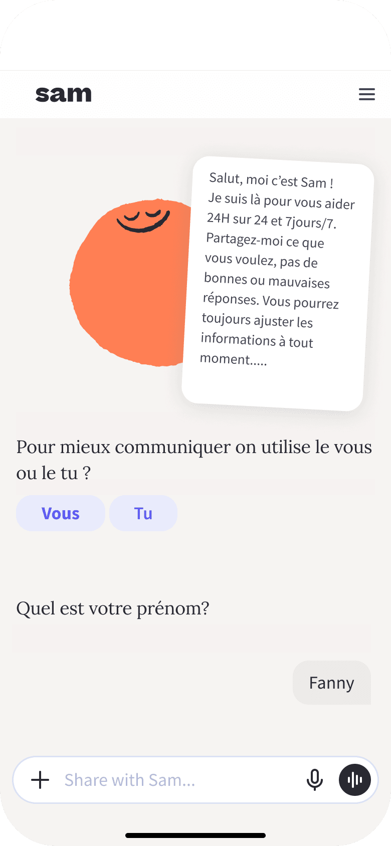 Disponible jour et nuit, Sam t’écoute et te guide à tout moment, pour alléger ton quotidien et tes relations.